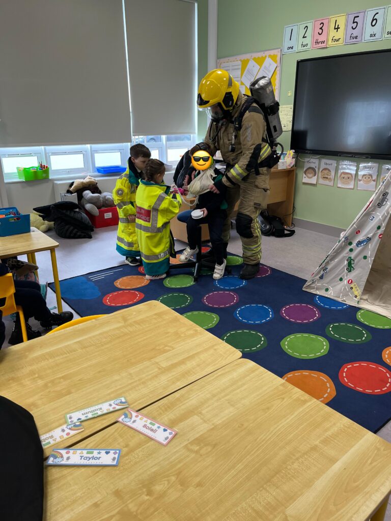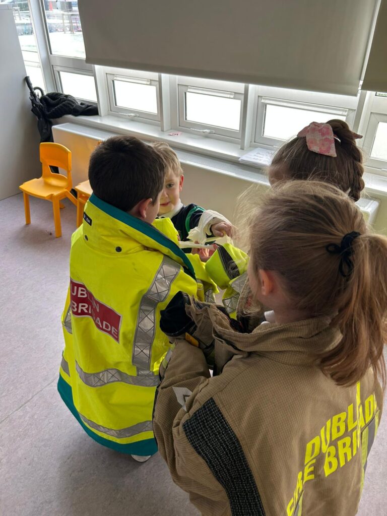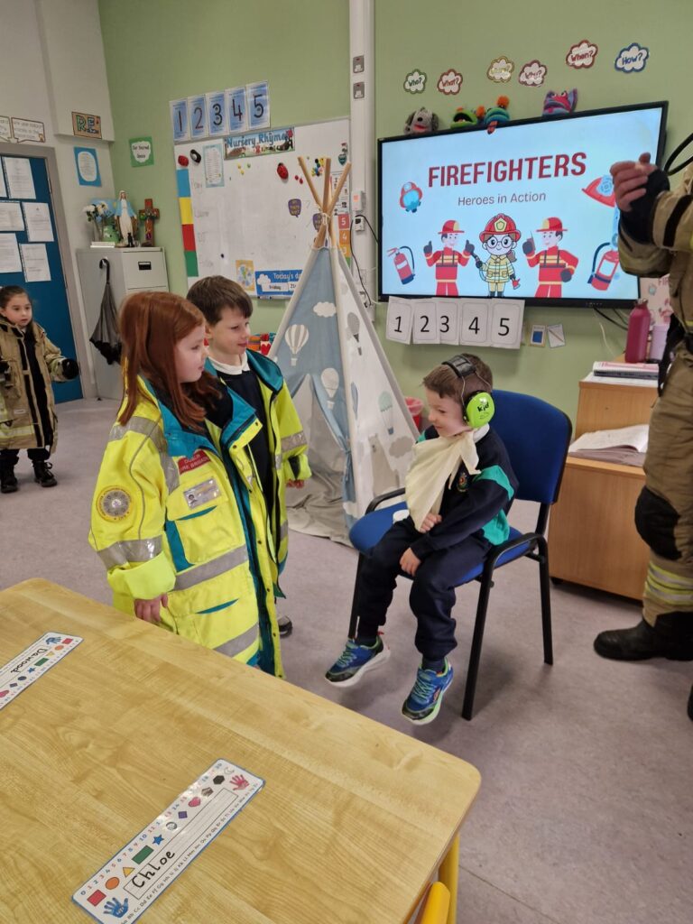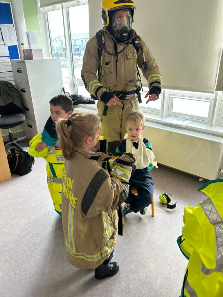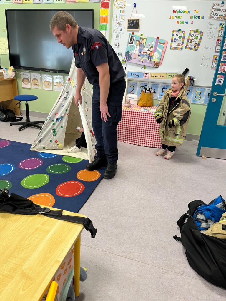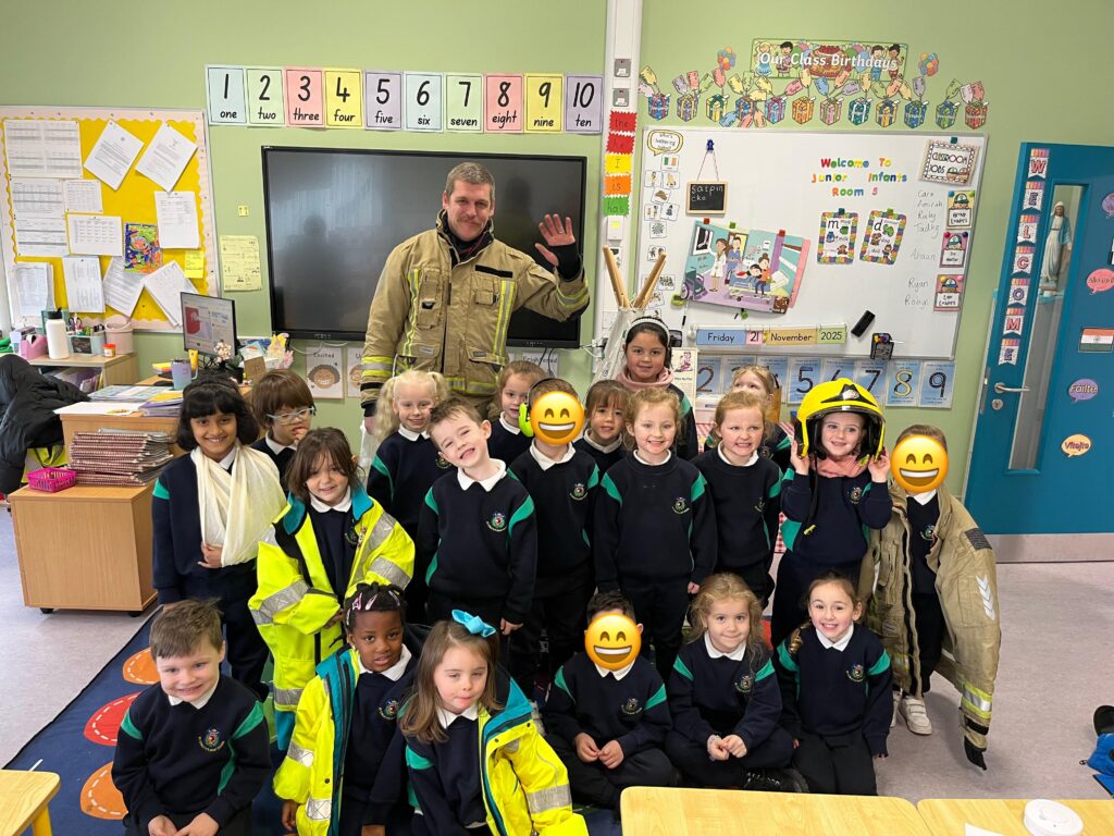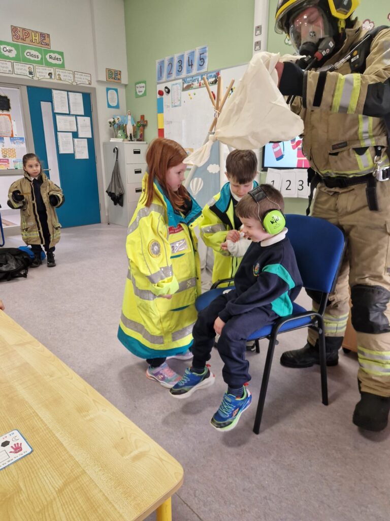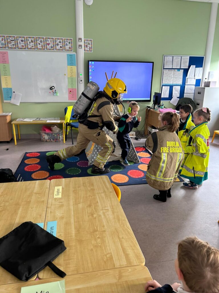 The boys and girls in Junior Infants were very excited to welcome firefighter/paramedic Alex from Dublin Fire Brigade who visited us last week. He showed us the equipment paramedics and fire fighters use, taught us how to call 999 and how to test our smoke alarm.
